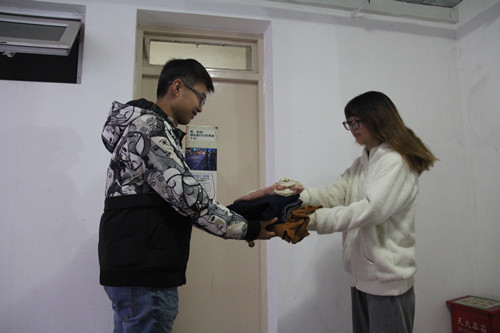 活动期间,海洋协会的干事们来到学生寝室中,宣传活动理念并向同学们收集闲置的厚衣物。在同学们的积极配合下,越来越多的人参与到“传衣行”活动中,捐出了各类御寒衣物,包括羽绒服、毛衣、雪地靴和手套等等。为了表示对爱心人士的感谢,海协干事们也向他们赠送了协会会衫留作纪念。整理、分类衣服后,海协将这些衣物随同协会制作的海洋科普宣传册一起分批打包,于12月6日邮寄到福建省莆田市涵江区微公益爱心驿站,之后将分发到贫困学生手中。
